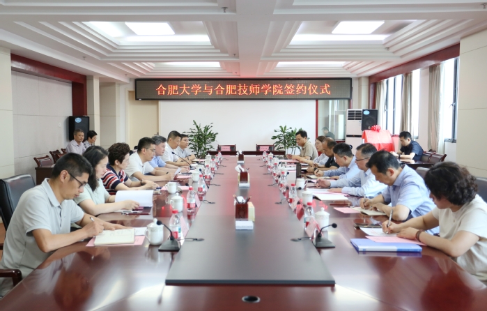 6月24日,我校与安徽合肥技师学院签约暨人才联合培养基地揭牌仪式在行政楼九楼东会议室举办,合肥市副市长何逢阳,合肥市人力资源与社会保障局党组书记、局长徐生彬,党组成员、副局长任清智,安徽合肥技师学院党委书记、院长程长风,党委委员、副院长姜玉茹,我校党委副书记、校长任永,党委委员、副校长王晓峰出席仪式,仪式由王晓峰主持。