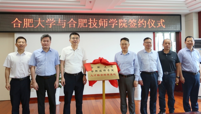 在现场领导嘉宾的共同见证下,我校大众学院党支部书记宣跃文与安徽合肥技师学院院长程长风分别代表两校签署合作协议。何逢阳、徐生彬、任永、王晓峰共同为人才联合培养基地揭牌。