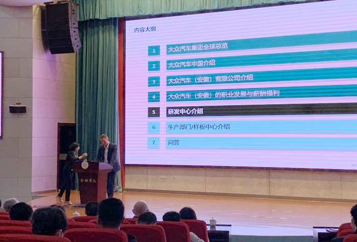 为深入开展大众汽车(安徽)有限公司与合肥学院的合作,协同推进校企合作培养人才,4月26日上午,大众汽车(安徽)在我校图书馆报告厅A厅召开校园宣讲会,此次宣讲会由大众汽车有限公司首席人力资源官卲剑主持,大众公司首席技术官吕尔曼、首席制造官施耐德、人力资源负责人曹垚、效率管理总监朱江萍来校宣讲,我校教务处、国际交流合作处、先进制造工程学院、人工智能与大数据学院等单位负责人,先进制造工程学院和人工智能与大数据学院部分大三大四学生参加会议。