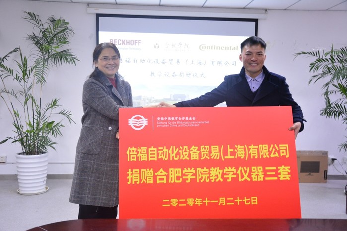 11月27日下午,倍福自动化设备贸易(上海)有限公司教学设备捐赠仪式在我校40栋会议室举行。副校长、安徽中德教育合作基金会(以下简称基金会)理事长陈秀出席捐赠仪式,倍福自动化设备贸易(上海)有限公司代表张洪彪、葛长响,大陆马牌公司代表汪鑫,校计划财务处处长、基金会秘书长何世昆以及中德教育合作示范基地(基金)管理办公室主任刘金平等参加了捐赠仪式。仪式由先进制造工程学院院长吕刚主持。