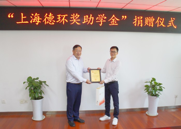 捐赠仪式上,双方签订捐赠协议。陈俊代表上海德环实业有限公司向基金会递送捐赠支票。何世昆代表基金会向上海德环实业有限公司颁发捐赠证书并赠送基金会宣传用品。