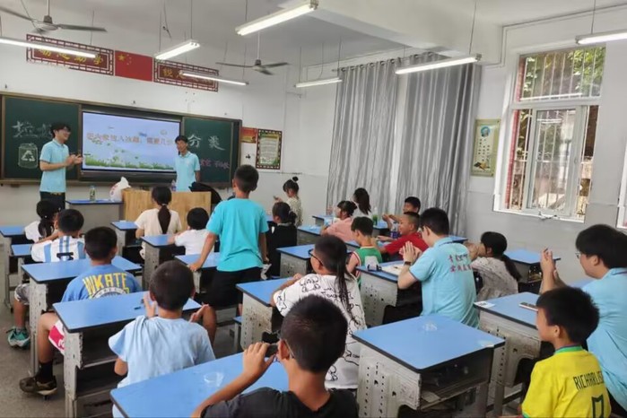 在大演乡中心小学,团队成员们围绕“垃圾分类”“国家公园建设深入乡村”“保护生物多样性,建设环保湿地公园”等主题开展校园宣讲。团队成员们讲述绿色环保故事,带领学生学习垃圾分类知识,引导他们树立节约环保的绿色生活理念。志愿团队还开展了“净滩”行动,带领当地学生沿着秋浦河下游清理垃圾,还原大演乡河滩美貌。