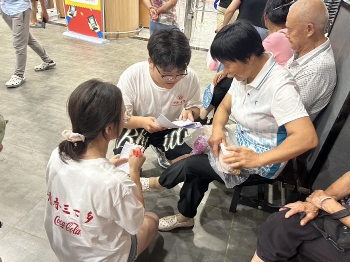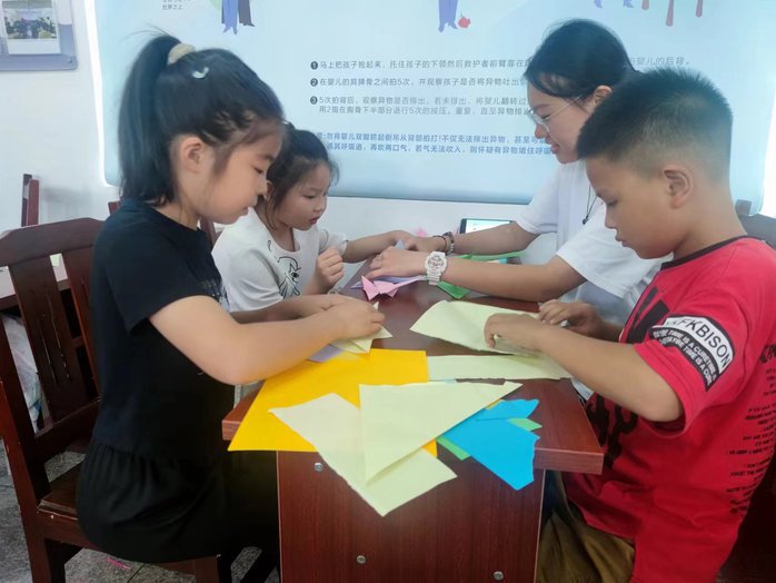 7月18日,同学们又去往五龙社区开展垃圾分类主题的公益课堂,耐心地指导每一个孩子进行折纸,丰富了儿童的课余生活。在霞涧社区,同学们不仅开展公益教学,为留守儿童献爱心,还与社区干部进行座谈开展党纪学习教育,强化了社区的凝聚力,营造了良好的文化氛围。